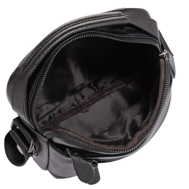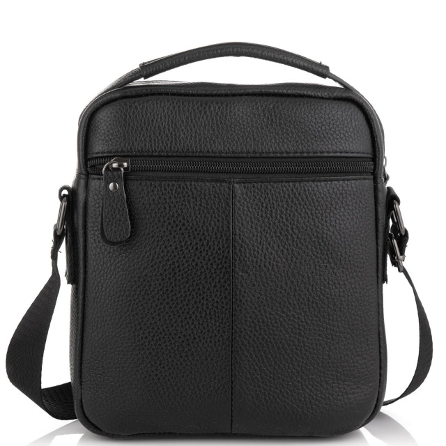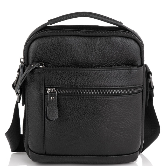 Шкіряний месенджер через плече. Зроблений з натуральної шкіри і має зернисту текстуру. Для носки є шкіряна ручка і текстильний ремінь через плече. Пуллера в чоловічій сумці - шкіряні. Одне основне відділення містить у собі кишеню на блискавці для дрібниць. З лицьового боку дві додаткові кишені на блискавці, з тильного боку також є кишеня горизонтального типу.