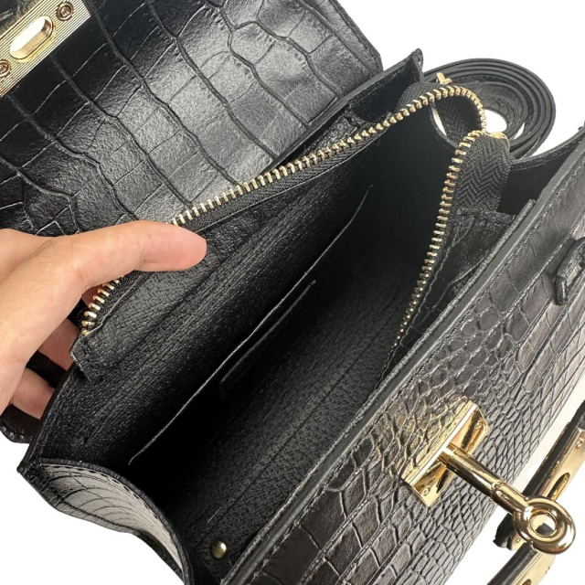 Одна коротка ручка та наплічний довгий ремінець зі шкіри регулюється по довжині, відстібається за допомогою карабінів.