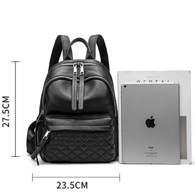 Жіночий шкіряний рюкзак міського типу виконаний в чорній шкірі з декоративною стеганую кишенею на блискавці. З боків є два невеликих кишені відкритого типу. Рюкзак на два відділення. В одному з відділень є кишеня відкритого типу, у другому - вшитий кишеню на блискавці, кишені-перегородка на блискавці. З тильного боку також є кишеня на блискавці. Фурнітура використана сріблястого кольору.