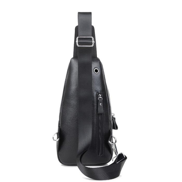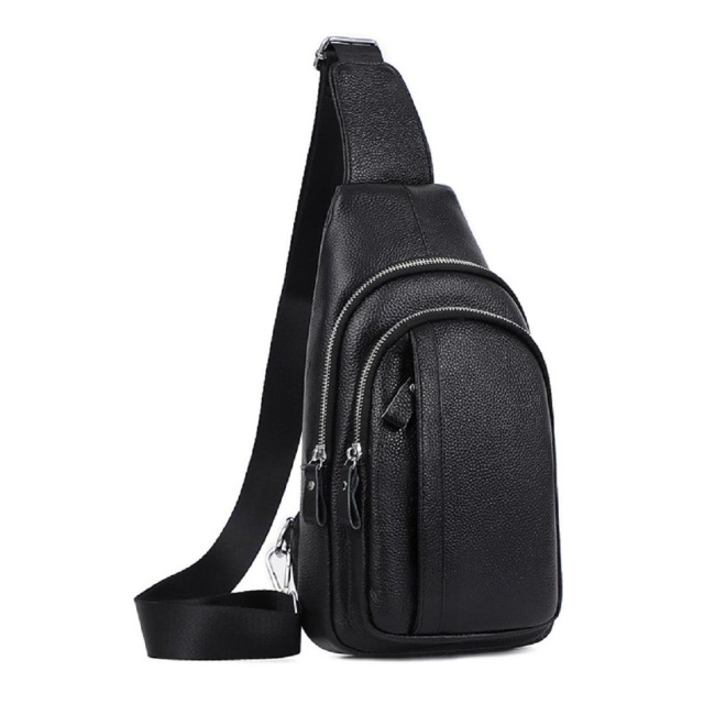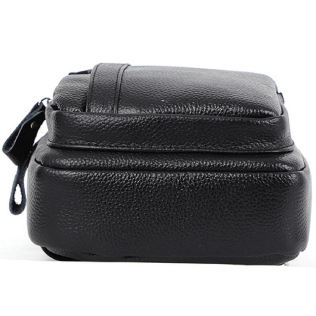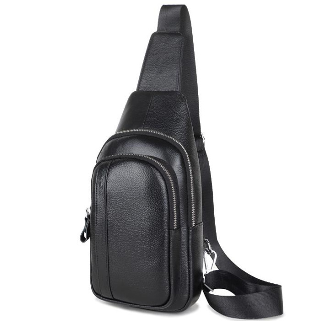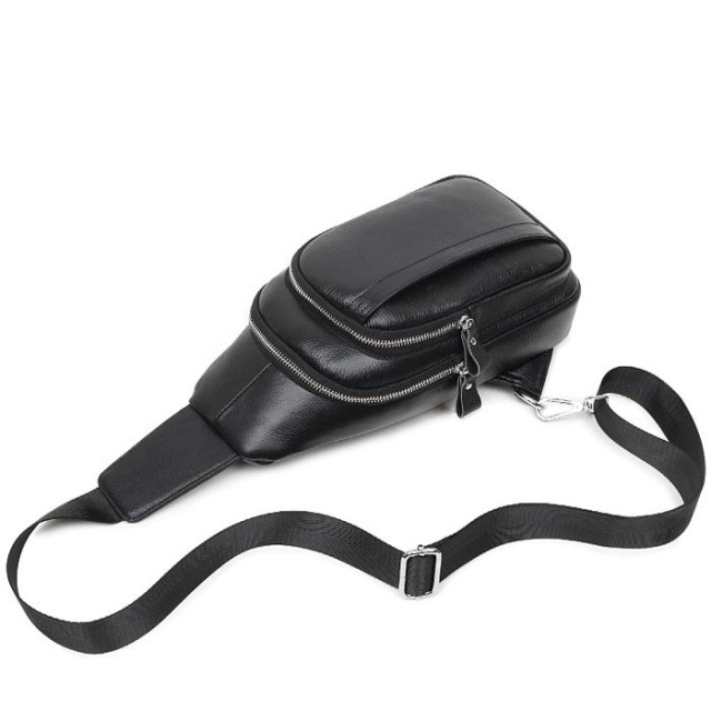 Чоловічий шкіряний рюкзак-бананка. Два основних відділу на блискавках і кишеня з лицьового боку. Срібляста фурнітура. Наплічну текстильну шлейку можна регулювати по висоті. Сумку можна носити на спині або на грудях. Усередині текстильна підкладка і дві невеликих кишені - одна на блискавці, а друга відкритого типу.