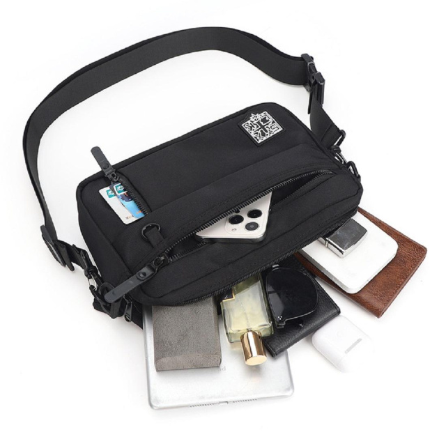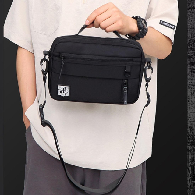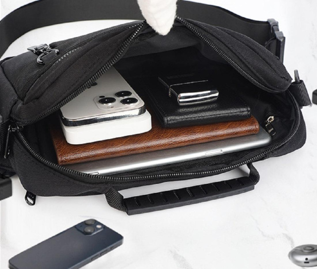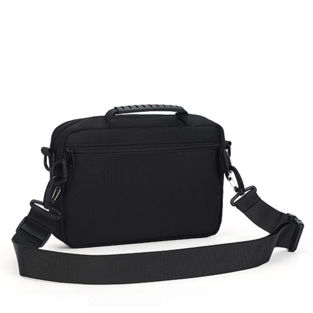 Наплічний текстильний ремінь, регулюється по довжині, знімається за допомогою карабінів. Є додаткові кріплення, що дозволяють перестебнути ремінець на задню спинку виробу та носити її як поясну сумку. Також модель оснащена короткою ручкою для зручності перноски.