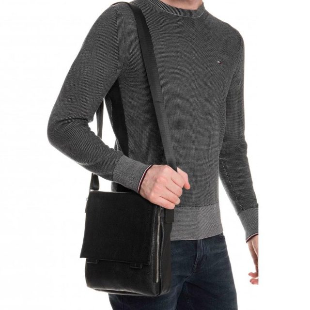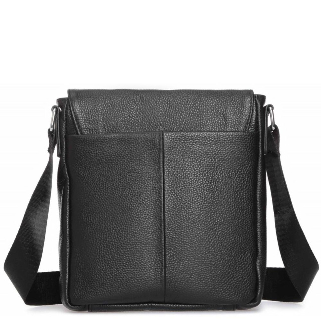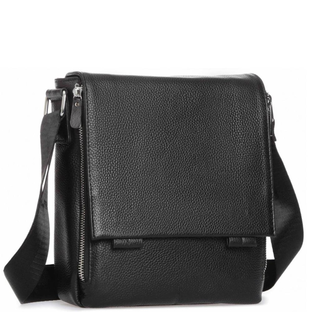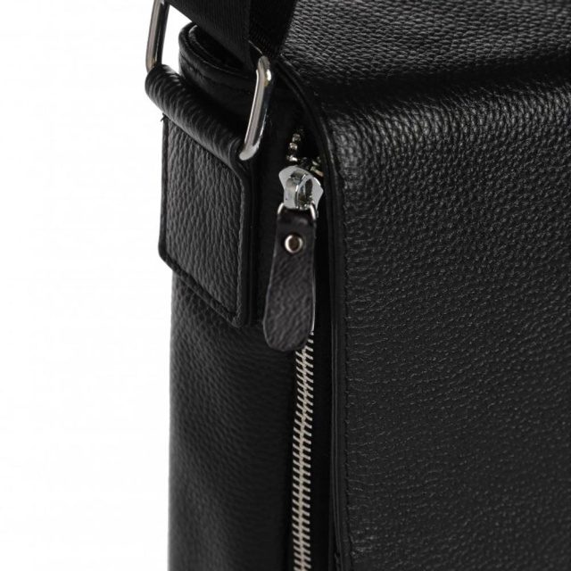 Чорна шкіряна сумка в чорному кольорі з зернистою текстурою. Сумка оснащена текстильним плечовим ременем, який регулюється по довжині, сріблястою фурнітурою і шкіряними пуллерами. Сумка має одне основне відділення, яке знаходиться під клапаном. Також з лицьового боку є кишеня відкритого типу. Клапан закривається на дві магнітні кнопки, з тильного боку є кишеня відкритого типу на магнітній кнопці. Основне відділення розділено на дві частини кишенею-перегородкою на блискавці, також всередині є кишеня відкритого типу і кишеня на блискавці.