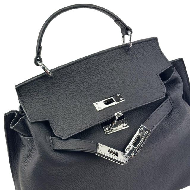 Наплічний довгий ремінець зі шкіри регулюється по довжині, відстібається за допомогою карабінів.