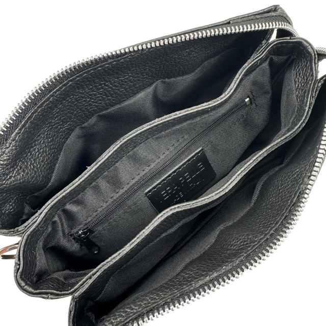 Сумка має одне основне відділення на блискавці. Усередині є дві перегородки, що поділяють виріб на три частини однакового розміру. Також усередині розташована додаткова невелика таємна кишенька на змійці.