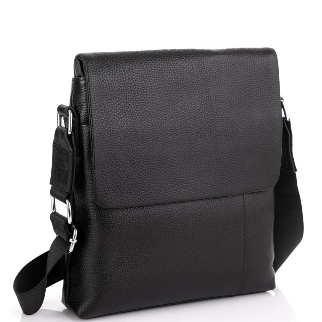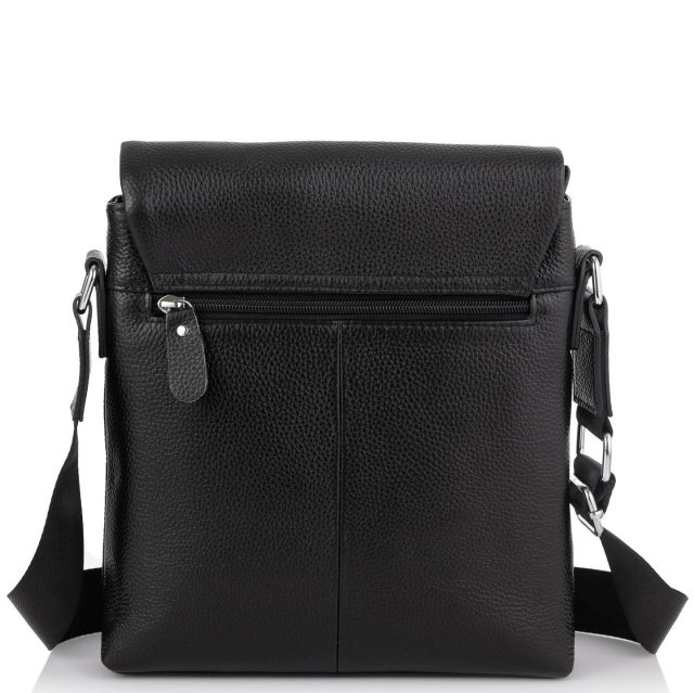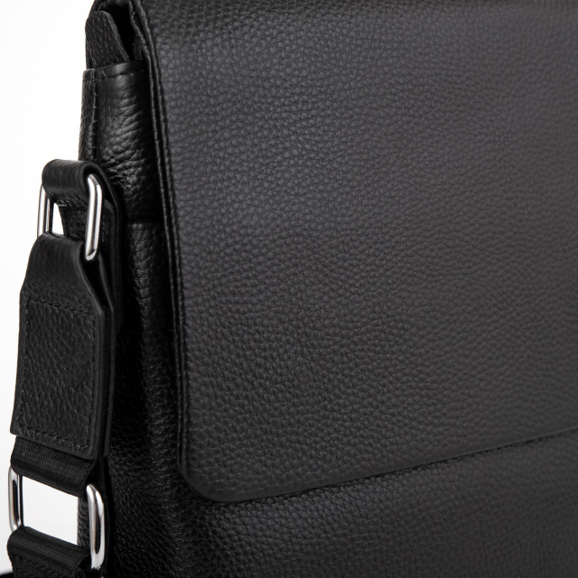 Мессенджер чорного кольору виконаний з натуральної шкіри зернистої структури. Текстильний плечовий ремінь регулюється по довжині, фурнітура срібного кольору. Усередині сумки - два основних відділення, дві кишені на замку і кишеня відкритого типу. З лицьового боку сумки - відкрита кишеня, з тильної - кишеня на замку. Закривається сумка через плече клапаном на магнітах.