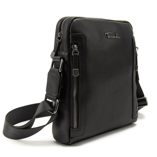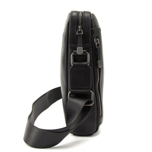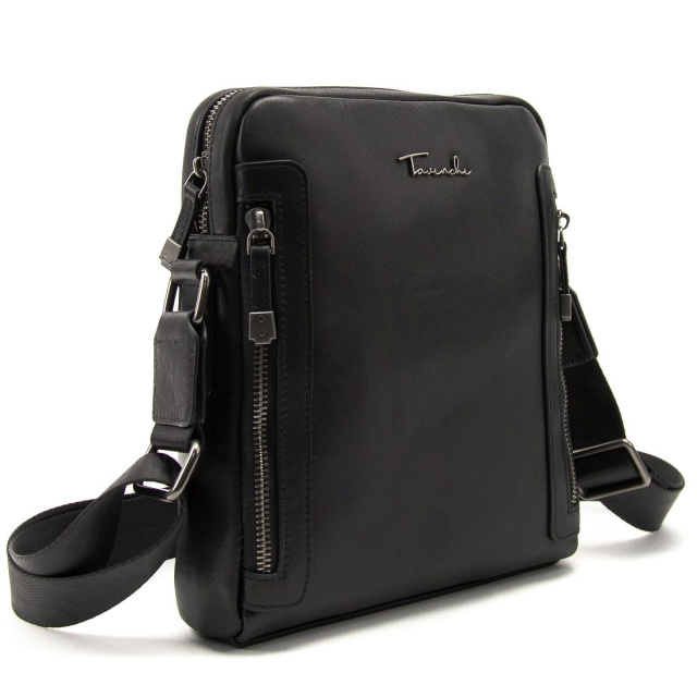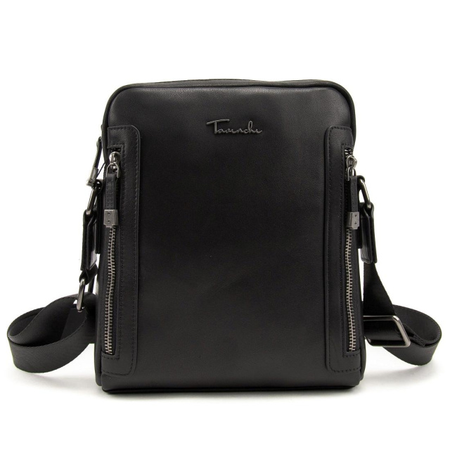 Чорна шкіряна сумка від Tiding Bag виглядає дуже стильно, за рахунок свого дизайну. Шкіра дуже приємна на дотик і має зернисту структуру. Сумку можна носити на плечі, для цього є ремінь через плече, який можна регулювати по довжині. Сумка має одне основне відділення, всередині якого кишеня на блискавці і одна відкрита кишеня. З тильного боку кишеня на блискавці з лицьового боку дві кишені на блискавці вертикального типу.