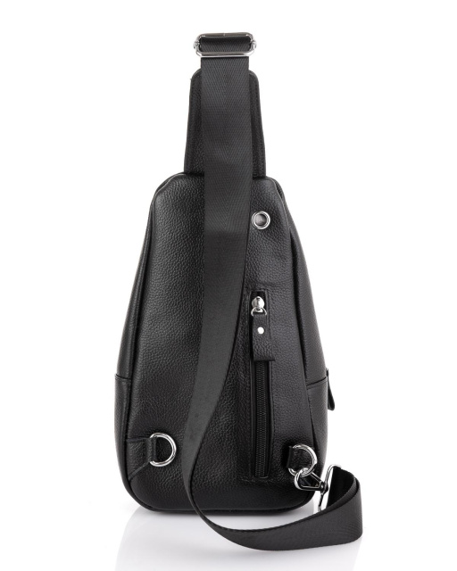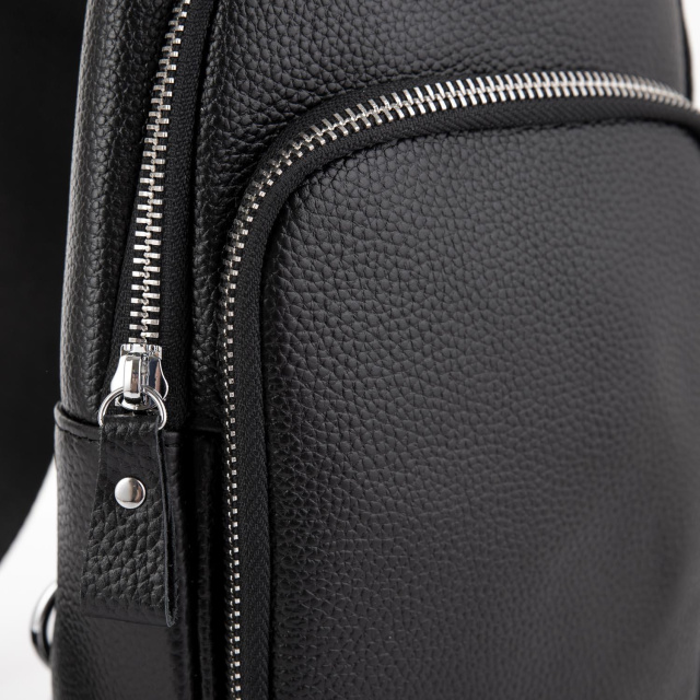 Компактний чорний слінг через плече. Наплечний текстильний ремінь можна перестібати за допомогою карабіна на ліву або на праву сторону. Фурнітура сумки-слінгу срібна. Сумку можна носити на спині або на грудях. Вона має два відділення з лицьового боку на блискавці і одну кишеню вертикального типу з тильного боку. Усередині сумки є одне основне відділення на блискавці і маленька кишеня відкритого типу.