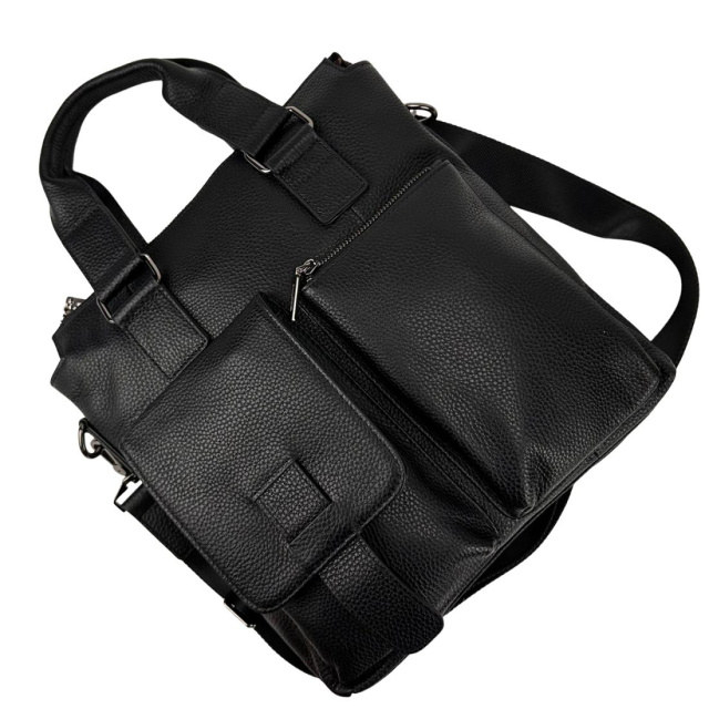 З лицьового боку є кишені з різною стилістикою: одна закривається на блискавці, а інша за допомогою відкидного клапана. Має зручні ручки та довгий регульований ремінь.