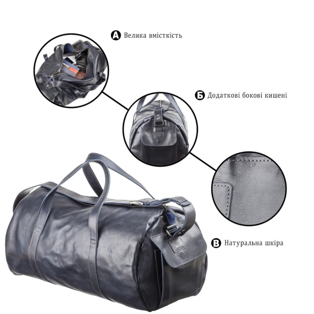 Багатофункціональна сумка для людей, які багато подорожують або активно займаються спортом. Така шкіряна сумка зручна і вмістка, завдяки матеріалам, що використовуються і дизайну, прослужить дуже довго і завжди буде актуальним і стильним аксесуаром.