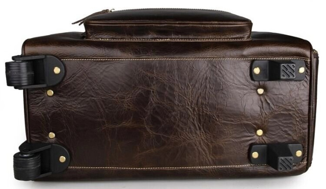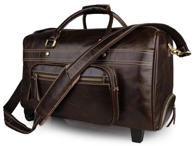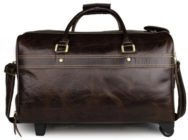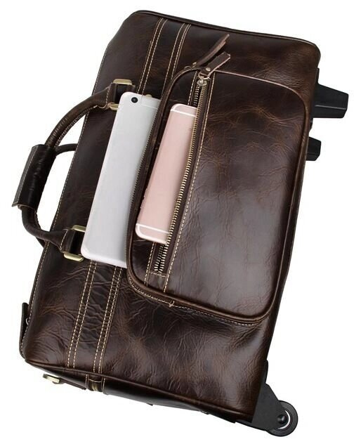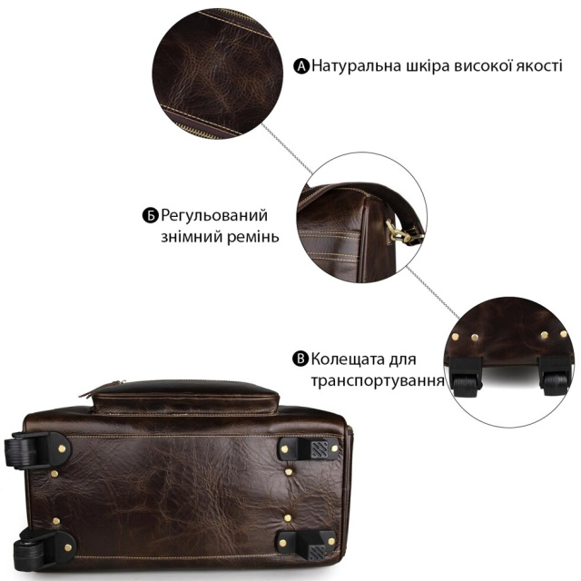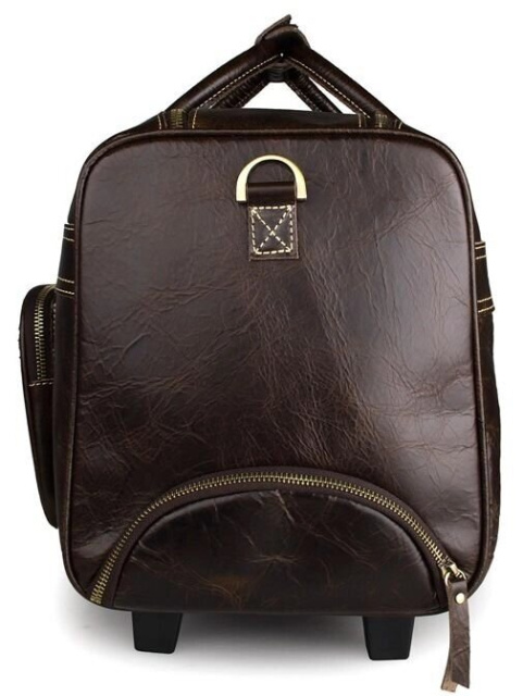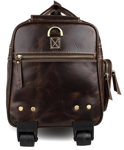 Елітна дорожня сумка на 2-х колесах з натуральної вінтажної шкіри. Колір фурнітури: латунь. На лицевій стороні сумки розташовані дві накладні кишені на блискавках. На одній бічній грані знаходиться відділення на блискавці, а на другій розташоване відділення для висувної ручки. Підкладка даного вироби виконана з міцної тканини чорного кольору. Сумку можна переносити в руці, через плече або ж котити за допомогою зручної ручки і наявності двох коліщаток. Аксесуар акуратно прошитий надміцною ниткою.