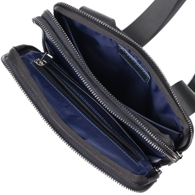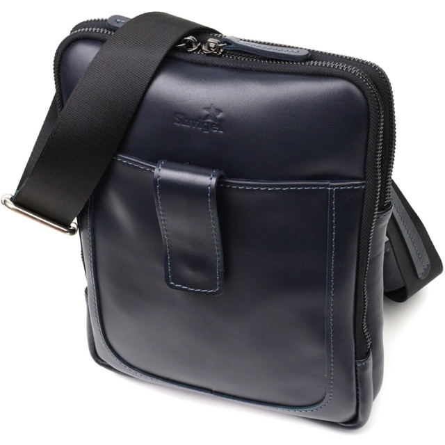 Стильна сумка із натуральної шкіри на два відділення. Модель в оригінальному синьому кольорі. Аксесуар складається з двох основних відділень на блискавках, кишені для планшета, двох кишень усередині – одна з них на блискавці та двох кишень зовні. У дизайні моделі немає ніяких зайвих деталей, при цьому сумка виглядає дуже модно і стильно. Сумка виготовлена з урахуванням усіх модних тенденцій. На лицьовій стороні моделі тиснення у вигляді логотипу бренду. Аксесуар доповнений текстильним незнімним ремінцем. Шкіряна сумка – найкращий подарунок для будь-якого чоловіка. Замовляйте цю модель як для себе, так і на подарунок.