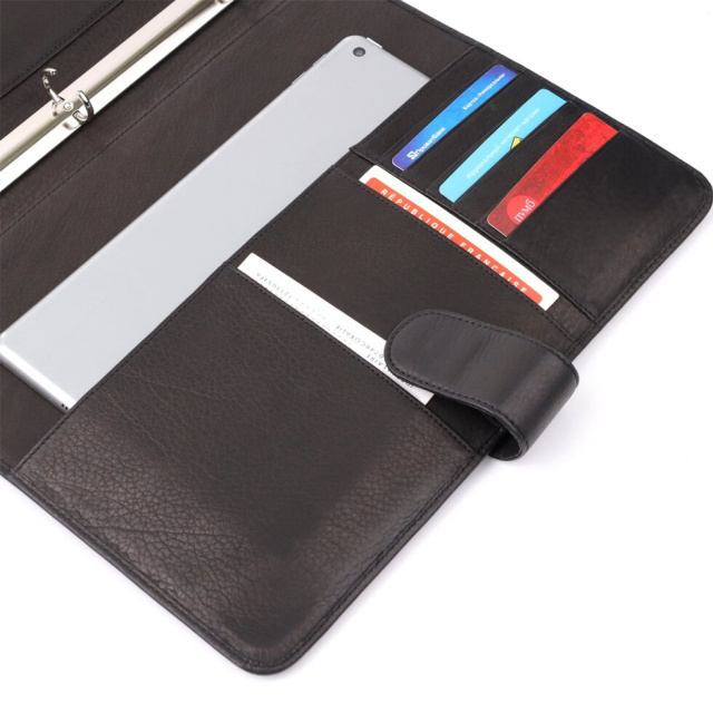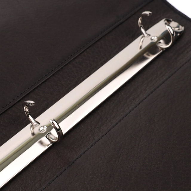 Органайзер із натуральної шкіри чорного кольору. Закривається хлястиком на кнопку – надійно та зручно. Усередині передбачено вісім осередків для карт, три прилеглі кишені та металевий тримач для файлів формату А4. На лицьовій стороні в правому нижньому кутку розташований фірмовий металевий логотип бренду, що підкреслює стиль і автентичність виробу.
