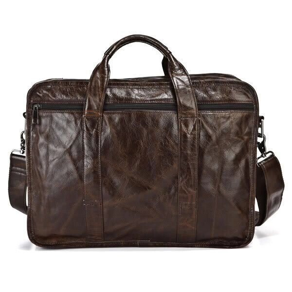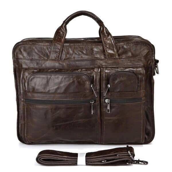 Дуже зручна, практична і функціональна шкіряна сумка благородного коричневого кольору. У таку сумку з легкістю поміщається ноутбук діагоналлю 15.6 дюймів. Аксесуар має зручні шкіряні ручки і плечовий ремінь, за допомогою якого сумку можна носити на плечі.