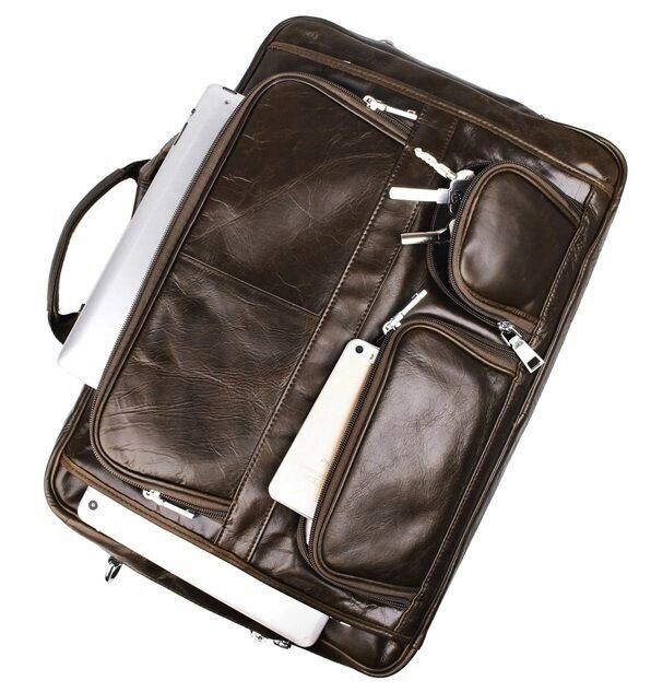 Велика чоловіча шкіряна сумка з безліччю відділень і кишень. Аксесуар можна переносити за допомогою зручних ручок в руці, а також через плече. На задній зовнішній стороні виробу розташована ручка, за допомогою, якої сумка при необхідності кріпитися до валізи. Колір фурнітури: срібло. Аксесуар можна використовувати для носіння папки з документами і ноутбука, а також як сумку для спортзалу.