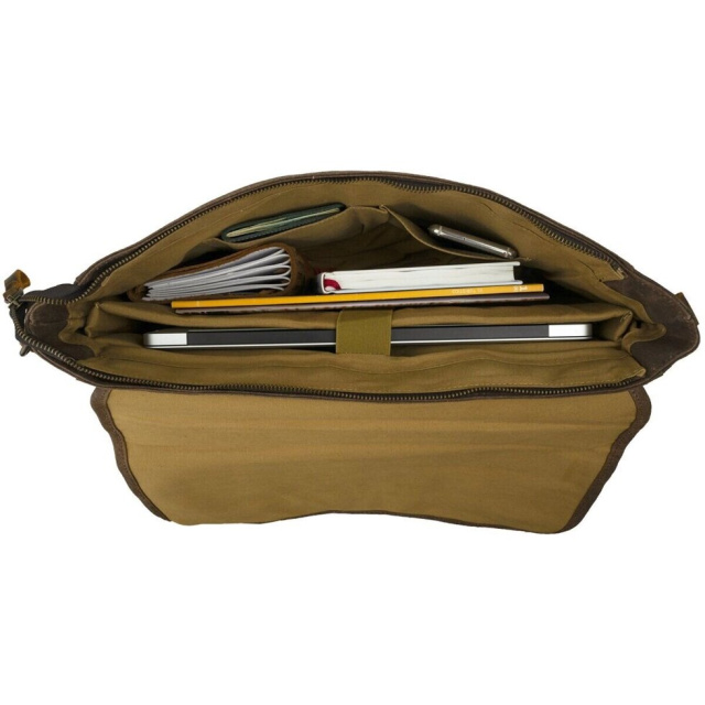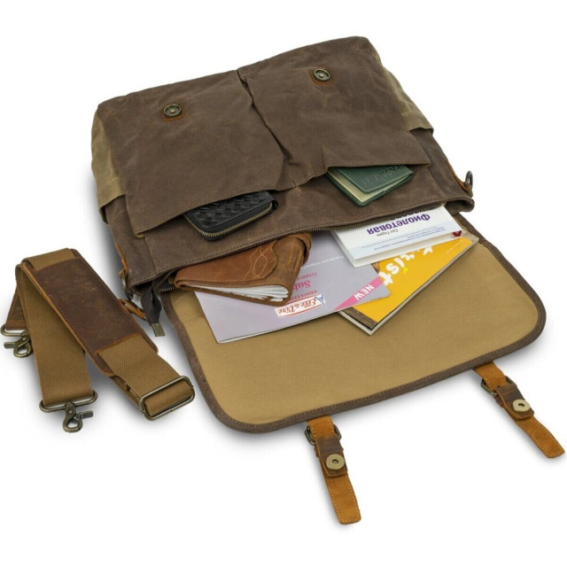 Місткий вінтажний чоловічий портфель з сучасним дизайном. Сумка виготовлена з вощеної парусини в поєднанні з натуральною вінтажною шкірою. В виріб легко поміститься ноутбук діагоналлю 15.6 дюймів. Модель дуже міцна. У дизайні сумка доповнена ремінцями на клапані. Модель має безліч зручних кишень і прекрасно підійде для повсякденного життя. Сумка поєднується з будь-яким вашим стилем. Така сумка стане хорошим і доступним подарунком для будь-якого чоловіка.