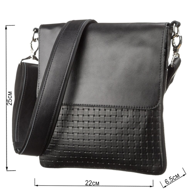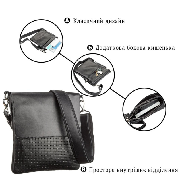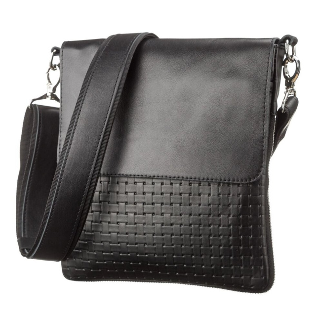 Стильна шкіряна сумка з натуральної гладкої шкіри, з елементами тиснення під "плетіння ". Аксесуар обладнаний надійною металевою фурнітурою під срібло. Внутрішня підкладка: якісний, міцний текстиль.