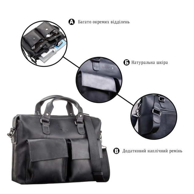 Чоловіча, зручна сумка (м'яка) для людей, які часто відправляються в ділові поїздки. Аксесуар виконаний з натуральної вінтажної шкіри, характерними ознаками якої є: неоднорідність забарвлення і потертості, які надають виробу вишуканого, індивідуального виду.