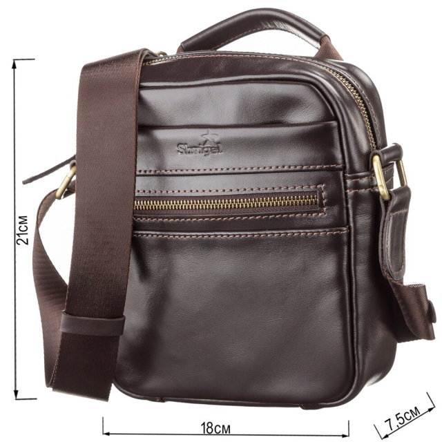 Компактна чоловіча сумка з натуральної високоякісної гладкої шкіри. Аксесуар прошитий світлою ниткою, що надає виробу міцності і оригінального вигляду. Даний аксесуар не тільки функціональний у використанні, але і доповнює елегантний образ сучасного чоловіка. Розмір сумки невеликий, але вмісткий і дуже зручний.