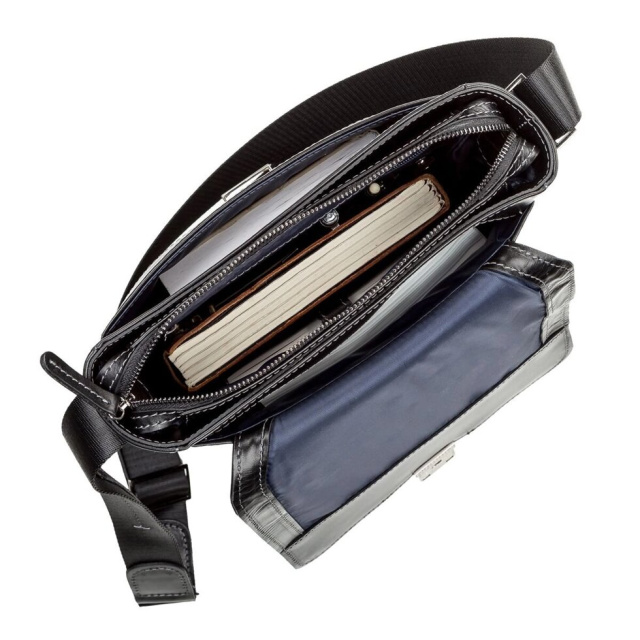 Всередині: плоска кишеня на змійці, кишеня для телефону, відділення для ручок і тримач для ключів, з протилежного боку кишеня з ущільненою перегородкою для планшета. Зовні: на передній стінці розташована накладна кишеня, на задній стінці плоска кишеня на блискавці.
