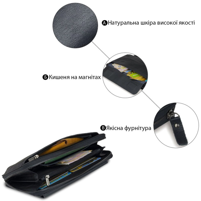- 2 відсіки для купюр з перегородкою монетницьою на змійці;