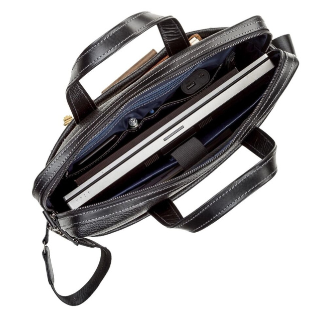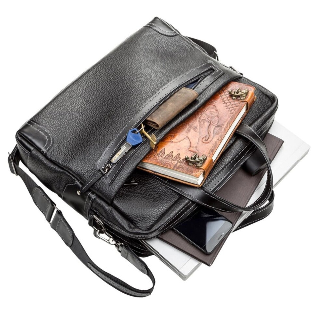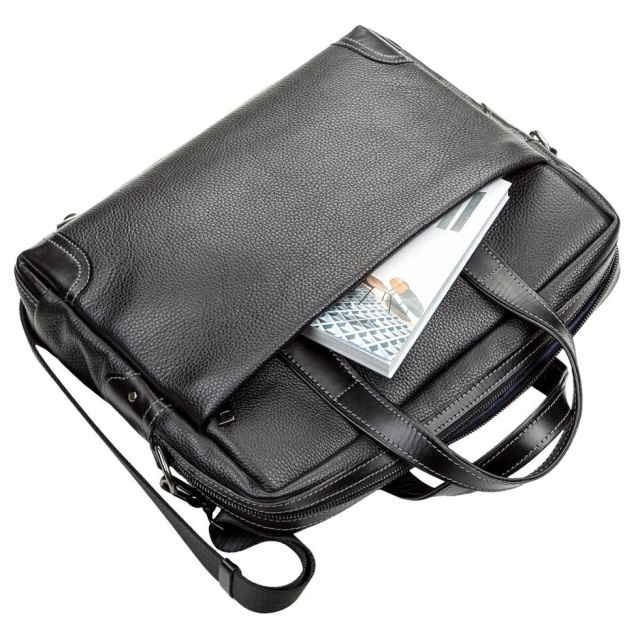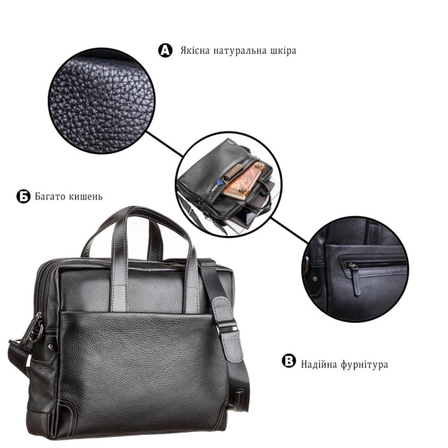 Багатофункціональна чоловіча сумка з двома зручними ручками для повсякденного використання, із зернистої натуральної шкіри, що дозволяє носити з собою ноутбук, папку з документами, особисті речі. Виріб складається з двох великих відділів, розділених ущільненою перегородкою.