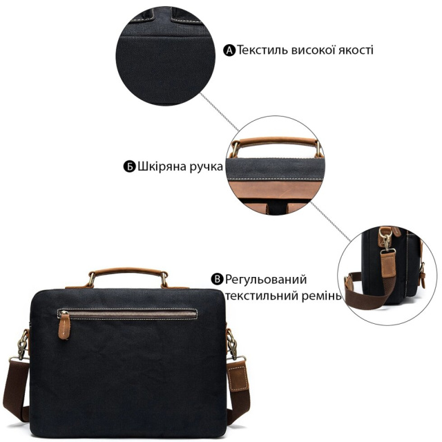 Ділова текстильна сумка зі вставками натуральної шкіри для чоловіків. В сумку легко поміщається ноутбук і папки з документами. Ідеальний вибір для самих зайнятих і ділових чоловіків. Модель ідеально тримає форму. По краях аксесуар прошитий світлою ниткою. Усередині сумки міцна текстильна підкладка коричневого кольору. Оригінальний дизайн сумки не залишать вас непоміченим. Ви будете приємно здивовані, як сумка довго буде носитися. Може бути прекрасним варіантом для подарунка чоловіку.