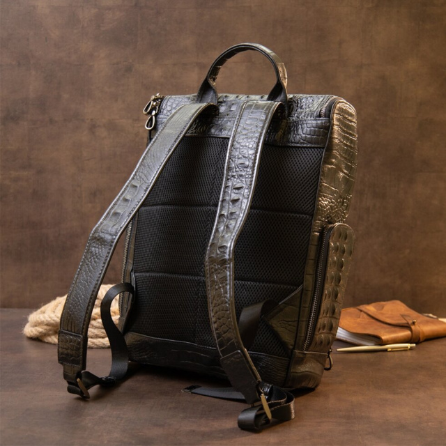 Місткий рюкзак з щільної шкіри, яка тримає форму. Виріб під рептилію. Рюкзак дуже функціональний і практичний. Підійде дана модель як для подорожей, так і на кожен день і як рюкзак для ноутбука. Виглядає дуже солідно і дорого. З таким рюкзаком буде зручно і ваші руки залишаться вільними. На тильній стороні ущільнена спинка сітка для вашого комфорту. Рекомендуємо рюкзак до покупки як для себе, так і на подарунок.