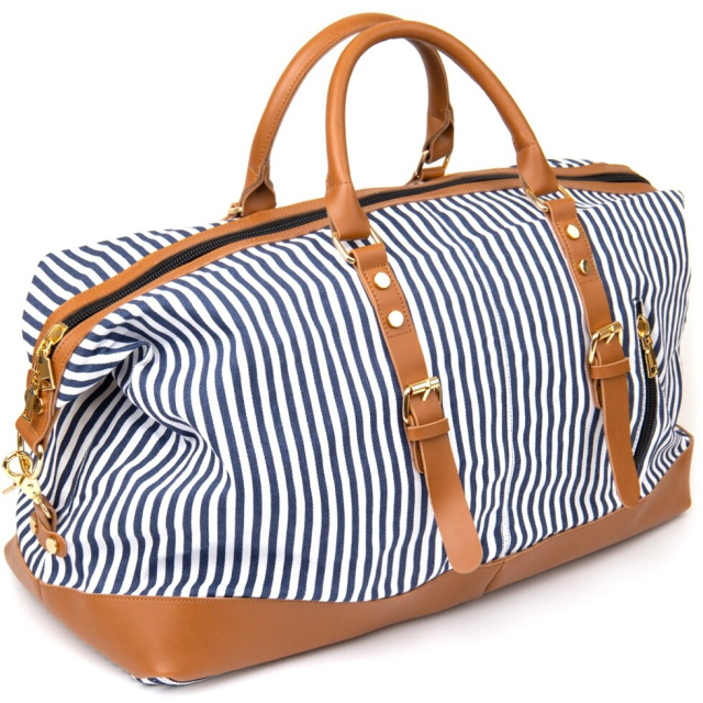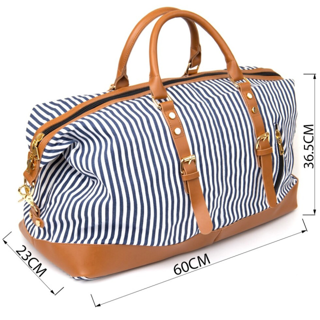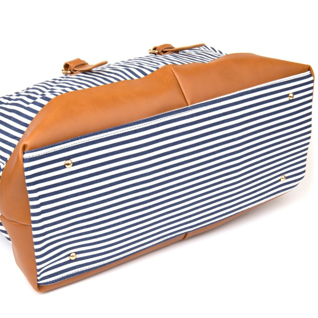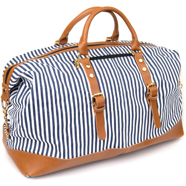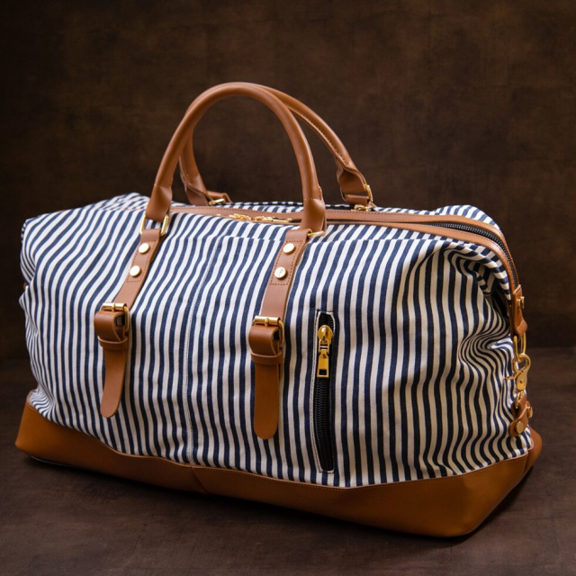 Дорожня текстильна сумка з дизайном в смужку і вставкою зі шкірозамінника. Знизу сумки металеві вставки, які захищають сумку від зносу знизу. Сумка дуже містка і чудово підійде в дорогу. Сумку ви можете носити як через плече так і в руках. Велика дорожня сумка підійде для ваших подорожей і відпочинку. Текстильна сумка - бюджетне рішення для вашого відпочинку.
