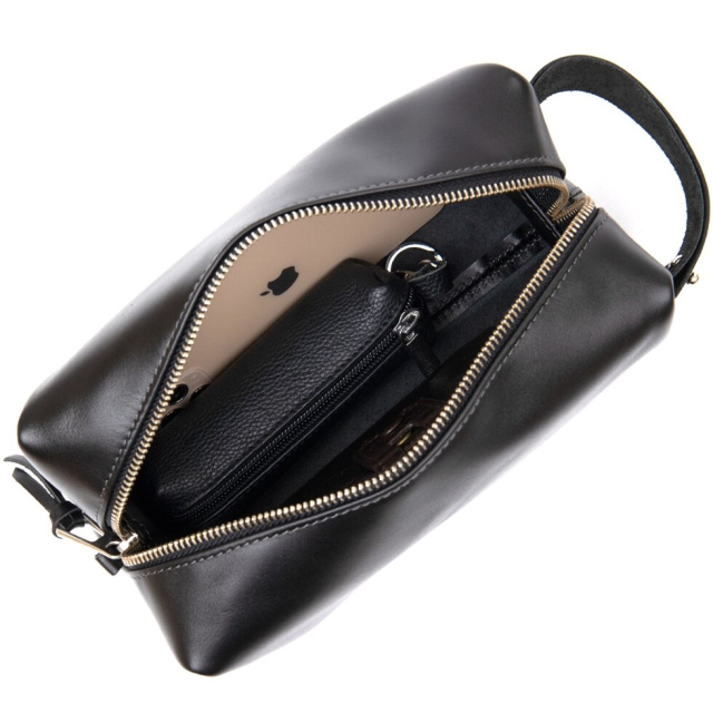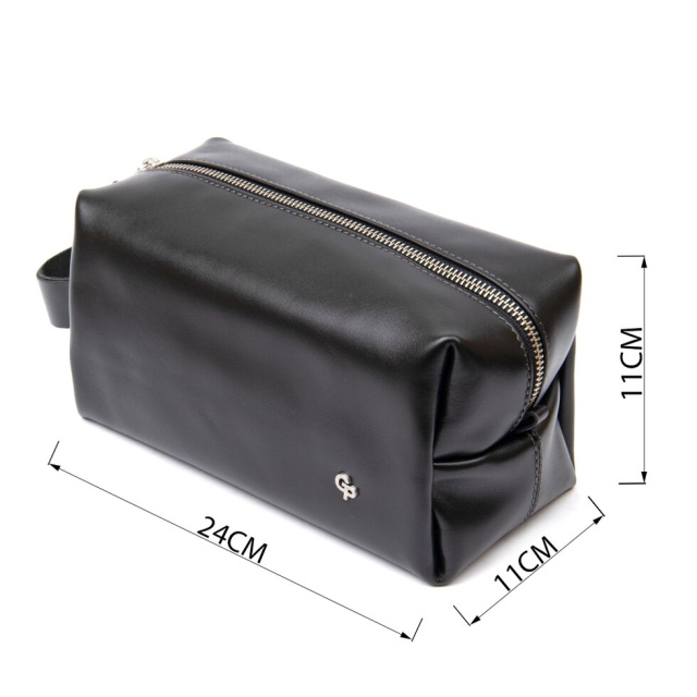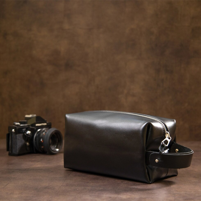 Зручна і практична чоловіча косметичка на всі випадки життя, її можна використовувати вдома для зберігання особистих речей, для поїздок, для спорту та іншого. Виконано аксесуар з зносостійкої натуральної шкіри високої якості. Колір виробу - чорний, фактура глянцева гладка. Упакований несесер в фірмову сумку-чохол.