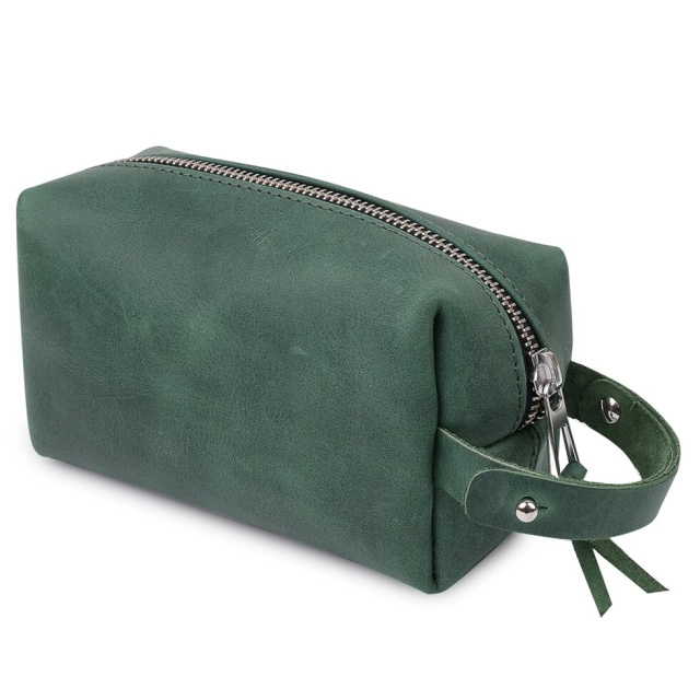 Оригінальна косметичка з натуральної висококласної шкіри з матовою гладкою фактурою. Закривається виріб на блискавку, збоку є шкіряна ручка, щоб переносити аксесуар в руках. Така косметичка підійде як жінкам, так і чоловікам для зберігання будь-яких необ'ємних цінностей.