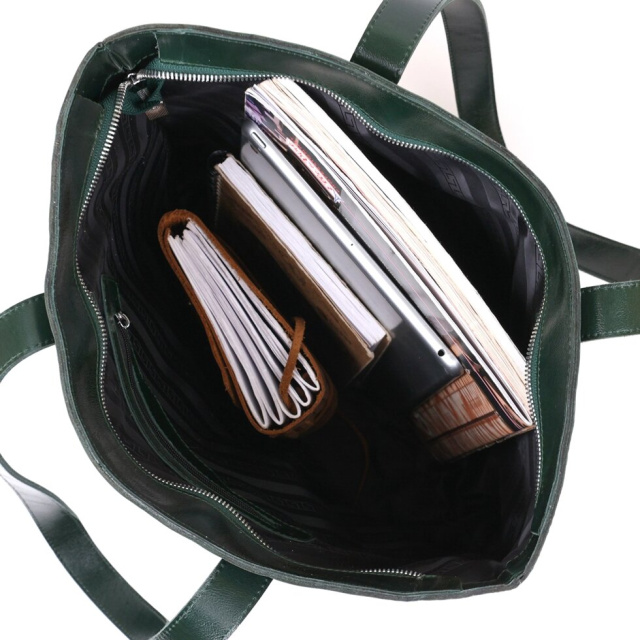 Чудова жіноча сумка-шоппер для сучасних ділових дам. Виконана вона із натуральної шкіри, висока якість якої видно навіть неозброєним оком. Колір виробу - зелений з легким блиском, що дуже модно цього сезону. Фактура - гладка і приємна на дотик. Закривається сумка на блискавку. Для перенесення передбачені дві міцні шкіряні ручки