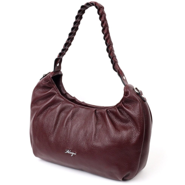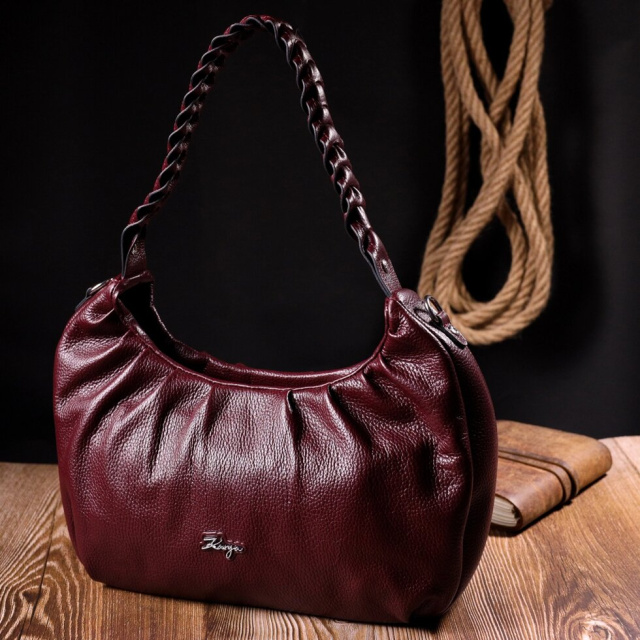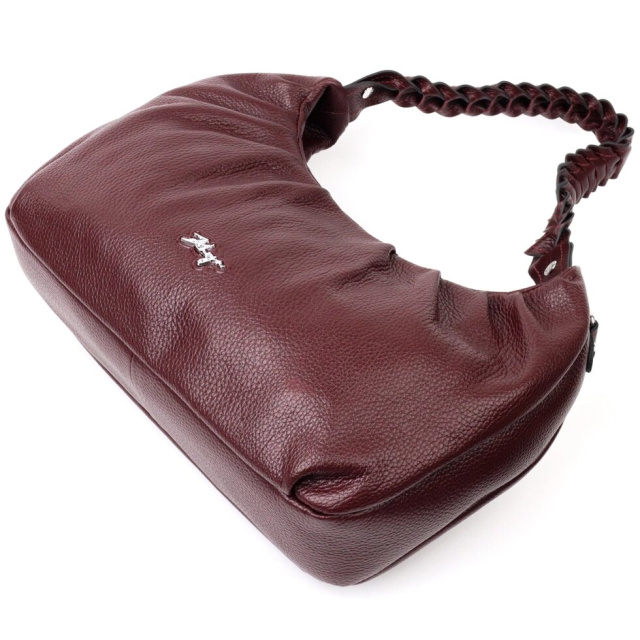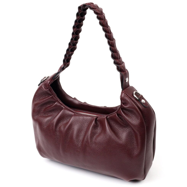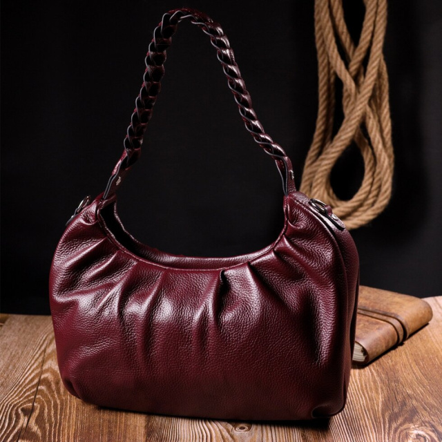 Відмінна сумка-багет середнього розміру з натуральної великозернистої шкіри, в бордовому кольорі. Виріб має надійну плетену ручку для перенесення в руці, а також знімний шкіряний і регульований по довжині, плечовий ремінь. Сумка функціональна та зручна в експлуатації, виріб має якісну фурнітуру сріблястого кольору та міцну підкладку. Аксесуар упакований у фірмовий текстильний мішок Karya. Сумка з натуральної шкіри завжди буде чудовим подарунком будь-якій жінці