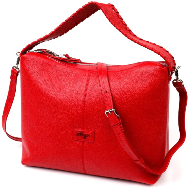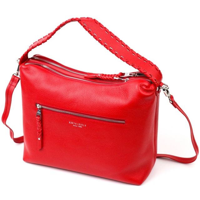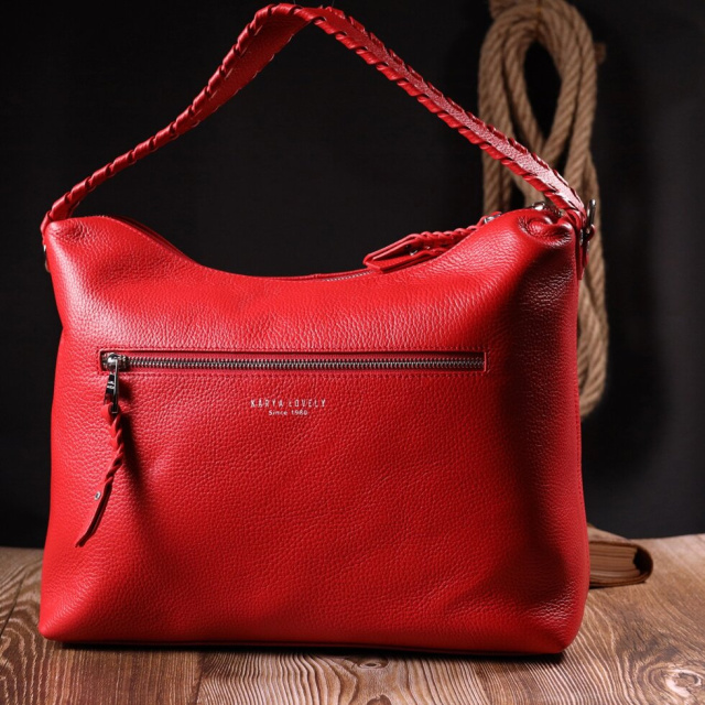 Яскрава містка сумка жіноча з натуральної зернистої шкіри, красивого червоного кольору. Сумка практична та функціональна в експлуатації, якісна фурнітура сріблястого кольору не тільки доповнює стильний дизайн сумки, але й захищає виріб. Аксесуар упакований у фірмовий текстильний мішок Karya. Сумка з натуральної шкіри завжди буде чудовим подарунком будь-якій жінці.