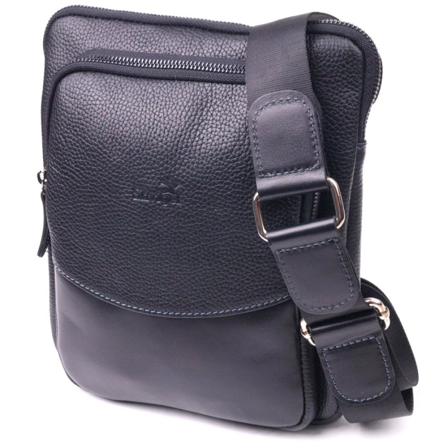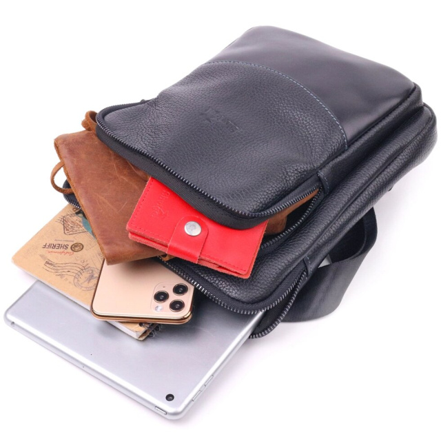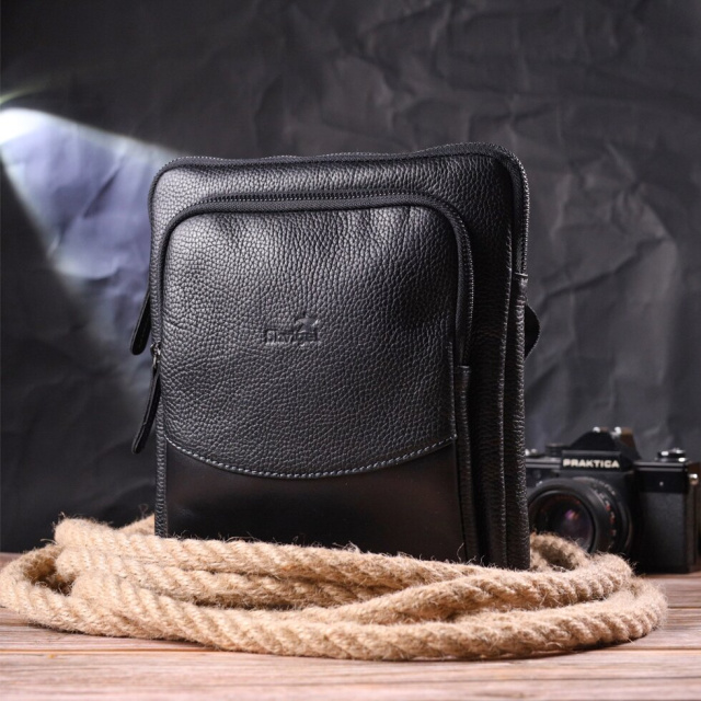 Практична чоловіча сумка-планшет, з натуральної шкіри, у комбінації двох фактур, гладкої та зернистої. Аксесуар має два основні відділення на блискавках, а також три внутрішні невеликі кишеньки, дві з яких також на блискавках. Фурнітура у виробі представлена темним сріблястим кольором. Чудовий подарунок для стильного, сучасного чоловіка.