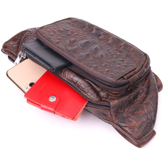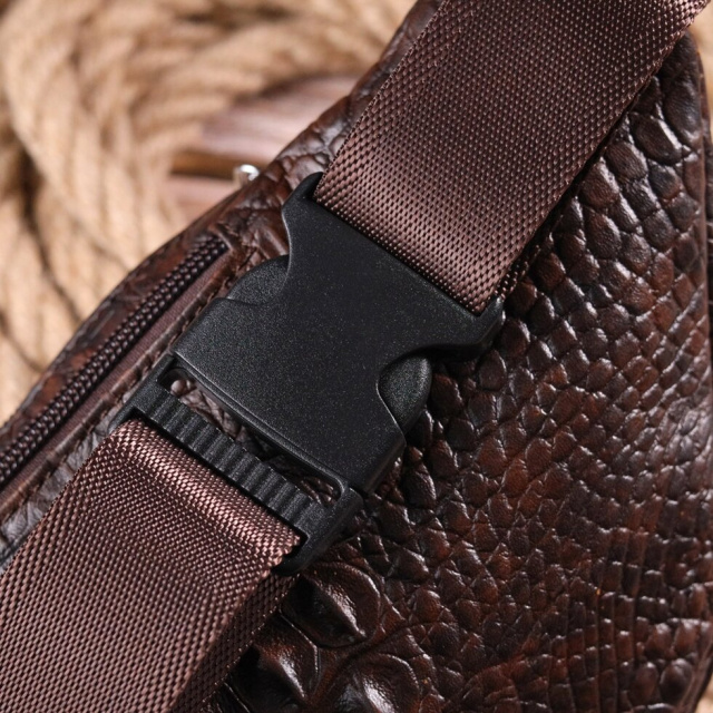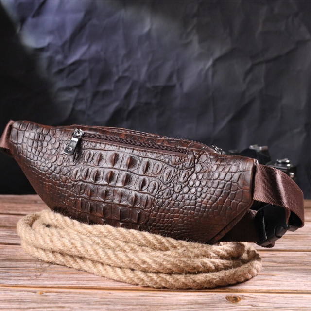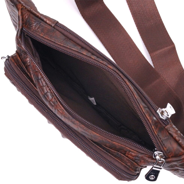 Стильна сумка для чоловіків з натуральної фактурної шкіри високої якості, з тисненням під крокодила. Бананка – одна із найпопулярніших моделей серед наших клієнтів. Така сумка стане дуже практичною та незамінною для будь-якого чоловіка. Сумка має одне основне відділення, три кишені зовні. Металева фурнітура представлена у сріблястому кольорі. Виріб стане чудовим подарунком для близької людини.