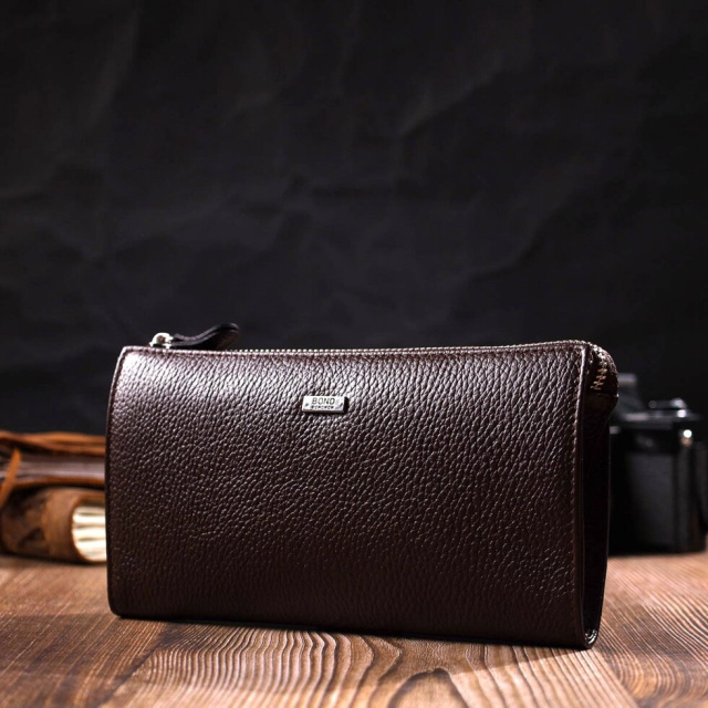 Надійний чоловічий клатч із натуральної якісної шкіри, закривається виріб на блискавку, всередині можна без проблем розміщувати паперові банкноти, банківські картки та навіть смартфон. Аксесуар складається з двох відділень для купюр, двох прилеглих кишень, дванадцяти слотів для кредиток та монетниці на блискавці. Є також ручка для долоні на тильній стороні клатчу та знімний кистьовий ремінь. Продається клатч у красивій коробці від виробника. Якісний і надійний клатч - саме такий аксесуар повинен бути у кожної людини, що поважає себе.