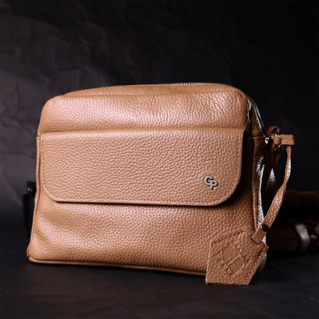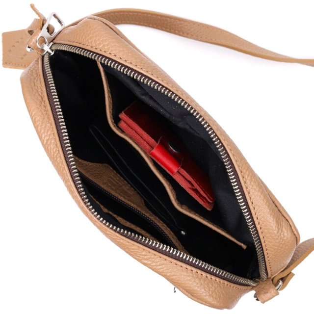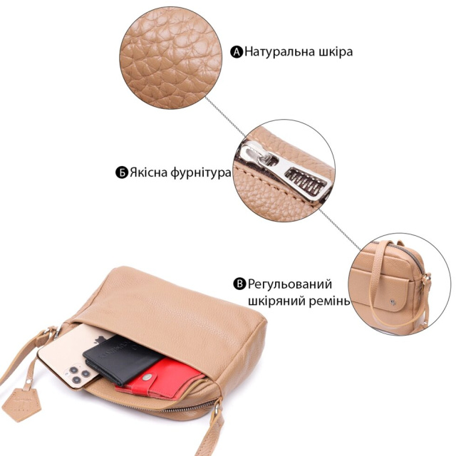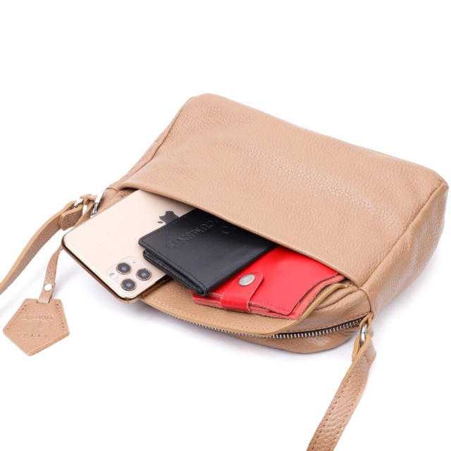 Ніжна жіноча трендова сумка через плече, на кожен день. Аксесуар складається з основного відділення, що закривається на блискавку, кишені відкритого типу та кишені на блискавці всередині, зовнішньої кишені на блискавці, на тильній стороні та накладної кишені на лицьовій стороні, що закривається клапаном на магніти. Виконана з міцної та зносостійкої натуральної шкіри. Фурнітура срібного кольору, регульований шкіряний плечовий ремінь. Упакована ця сумка в гарний фірмовий чохол із ручками.