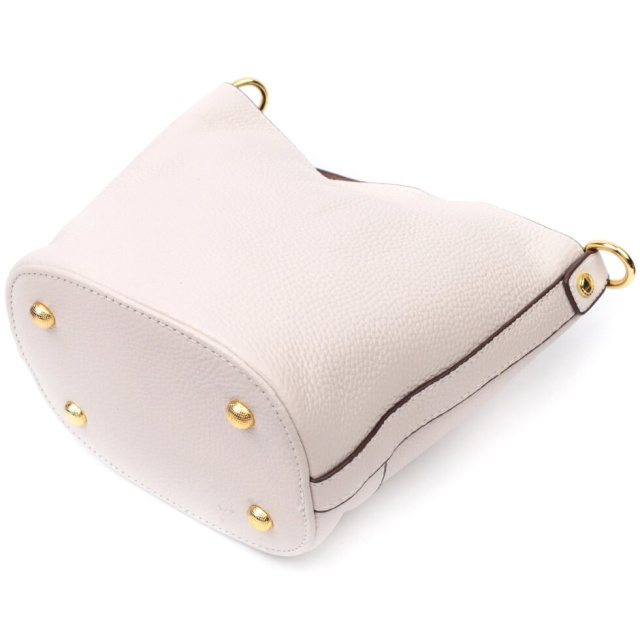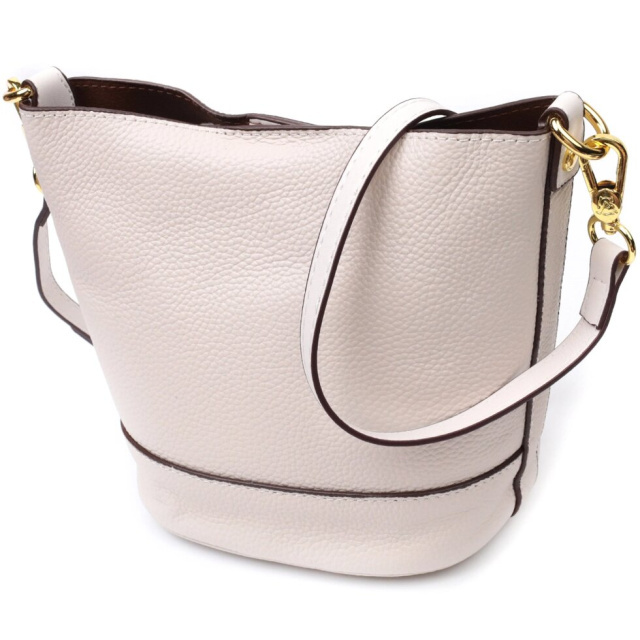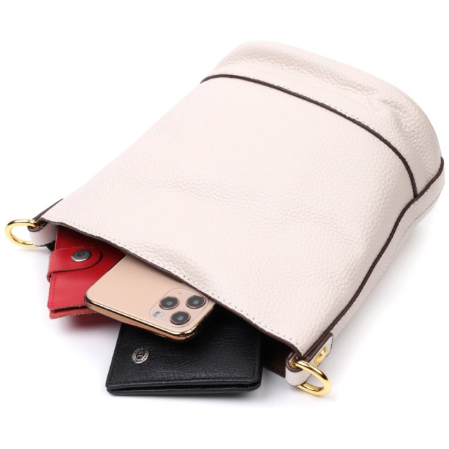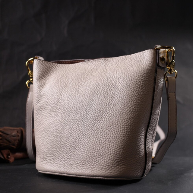 Зручна жіноча сумка з твердим дном, без підкладки та з косметичкою всередині. Виріб пошитий з якісної натуральної шкіри, яка довго носиться і не втрачає свого первісного вигляду. Аксесуар складається з одного відділення, в якому пристібається косметичка, що закривається на блискавку. Носити сумку можна на плечі і через плече, для цього є шкіряний ремінь, що знімається. У виробі використано якісну фурнітуру кольору жовтого золота. Універсальний варіант сумки як на вечір так і як сумочка на кожен день.