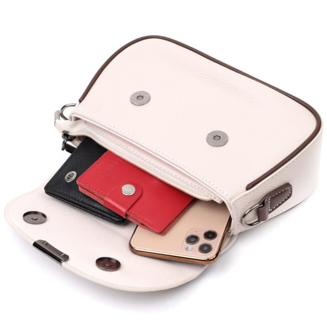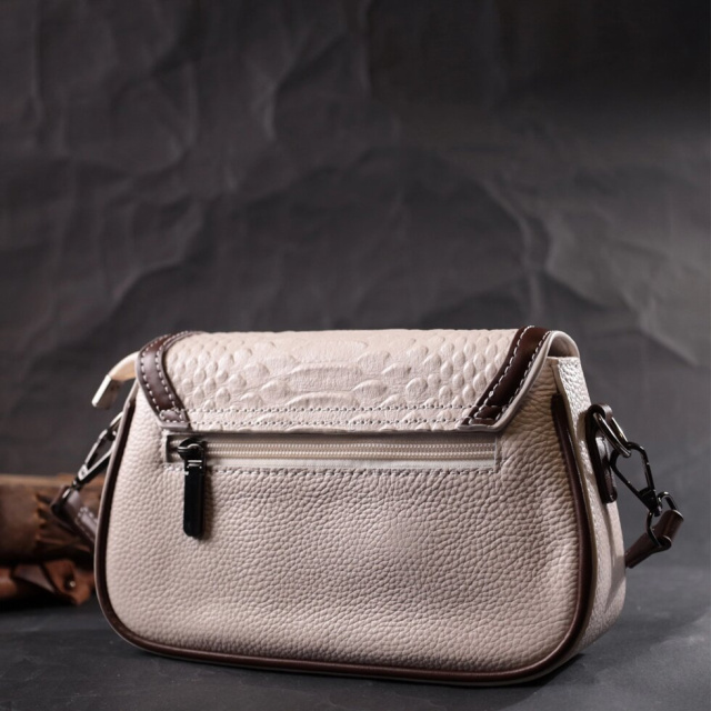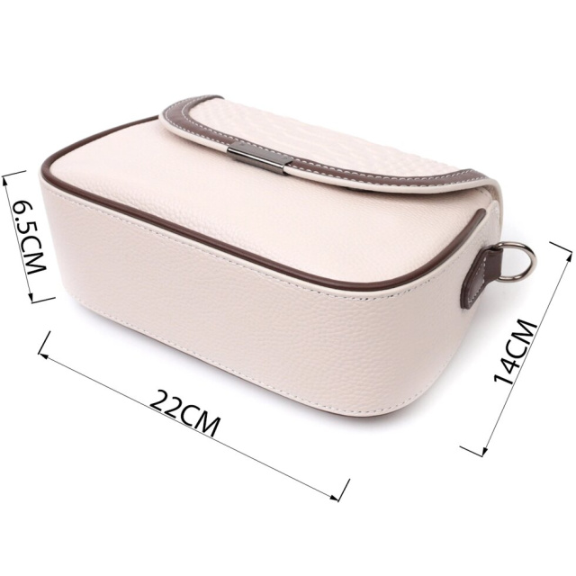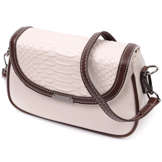 Каркасна жіноча сумка з натуральної шкіри флотар, яка невибаглива у догляді та довго носиться. У виробі використана шкіра білого та коричневого кольору. Аксесуар складається з двох основних відділень, кишені-перегородки, потайної кишені на блискавці та кишені відкритого типу. Носити сумку можна в руці, під рукою, на плечі і через плече, для цього є шкіряний ремінь, що знімається. В аксесуарі використано якісну фурнітуру кольору срібла. Універсальний варіант сумки на вечір, щодня, а також відмінно поєднуватиметься з діловим стилем.