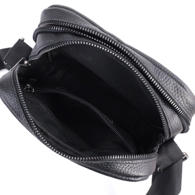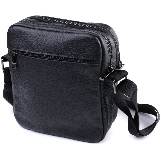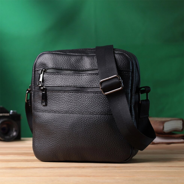 Зручна чоловіча сумка месенджер, з великою кількістю кишень, в яку помістяться всі необхідні речі і навіть міні айпад. Фурнітура металевого кольору - стійка не змінює свій колір у процесі носіння. Чудова чоловіча сумка вертикального формату виготовлена з натуральної зернистої шкіри чорного кольору. Аксесуар чудово поєднується з усіма стилями в одязі та може стати чудовим подарунком на будь-яке свято.