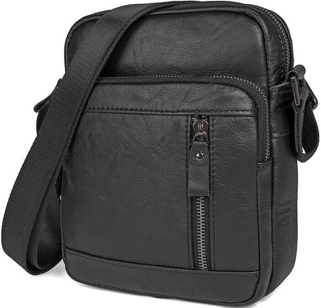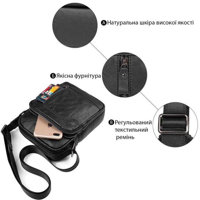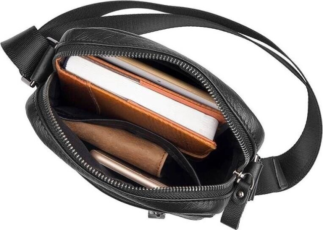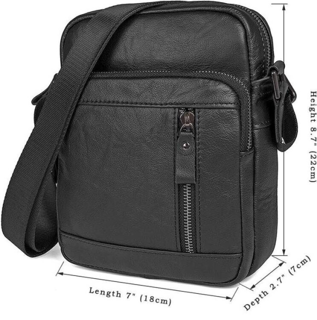 Зручна чоловіча сумка чорного кольору, з натуральної зернистої шкіри. Колір фурнітури: темне срібло. Аксесуар має невеликі розміри, але при цьому досить вмісткий і функціональний.