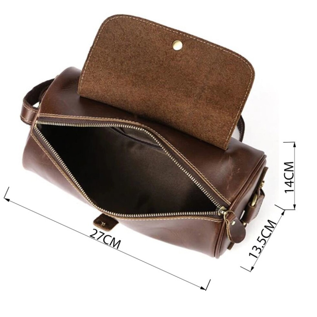 Оригінальна чоловіча сумка закругленою формою. З такою сумкою ви точно виділитеся з натовпу. Сумка прошита по периметру світлою ниткою. Фурнітура, використовувана в моделі золотистого кольору. Сумка виготовлена з натуральної шкіри високої якості. Хороший варіант для поїздок. Все саме важливе ви легко помістете в цю сумку. Модель упакована в тканинний мішок, що захищає її від пилу і зручний при зберіганні. Відмінний варіант для подарунка кожному чоловіку.