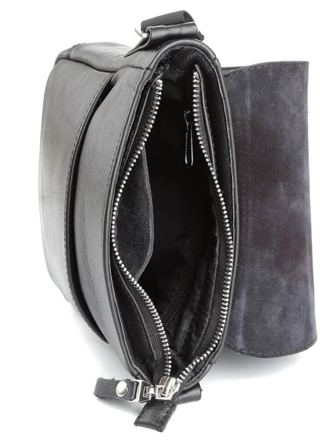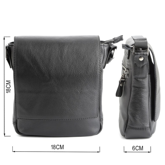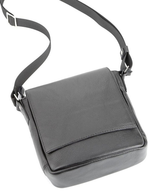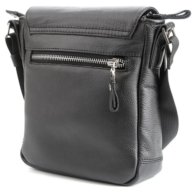 Компактна чоловіча шкіряна сумка через плече українського виробництва. Шкіра, з якої виконаний даний аксесуар, приємна на дотик і має зернисту фактуру. Колір фурнітури: срібло. Сумка закривається за допомогою клапана на двох прихованих магнітах і металевою блискавкою. Під клапаном розташована накладна кишеня. На задній зовнішній стороні даного аксесуара знаходиться відділення на блискавці. Сумка носитися через плече за допомогою регульованого текстильного плечового ременя.