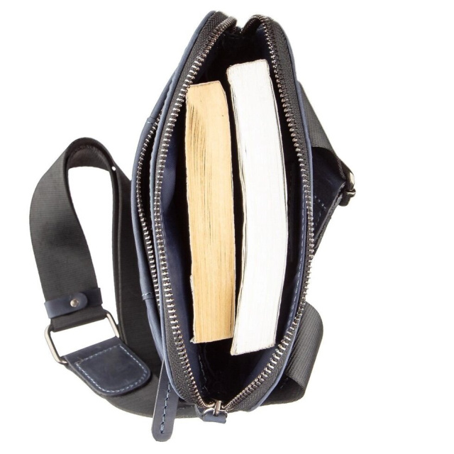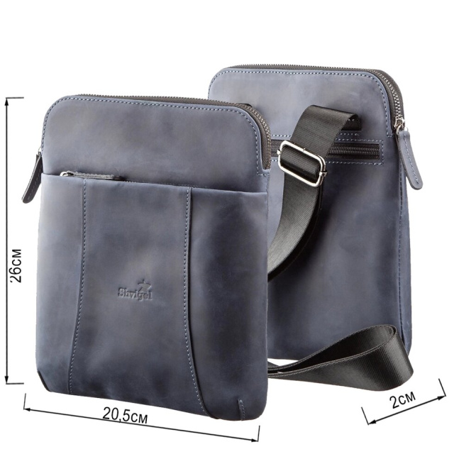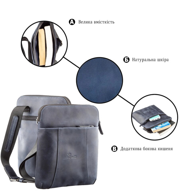 Компактна чоловіча сумка для планшета з натуральної шкіри Crazy horse. Головною особливістю такої шкіри є те, що з часом на ній можуть з'явитися потертості, які додають їй певного ефекту старовини. Саме за цей ефект її люблять багато клієнтів. Аксесуар довго носиться. Модель прошита рівною світлою ниткою. Незвичайний синій колір і її дизайн виділять вас з натовпу. У комплекті до моделі йде тканинний помаранчевий чохол, що робить її прекрасним варіантом для подарунка.