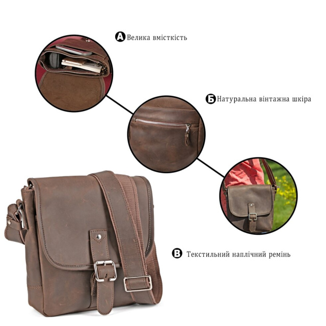 Сучасна чоловіча сумка через плече. Аксесуар виконаний з натуральної високоякісної вінтажної шкіри. Колір фурнітури: срібло. Сумка надійно прошита міцною ниткою. Шви - рівні, акуратні.