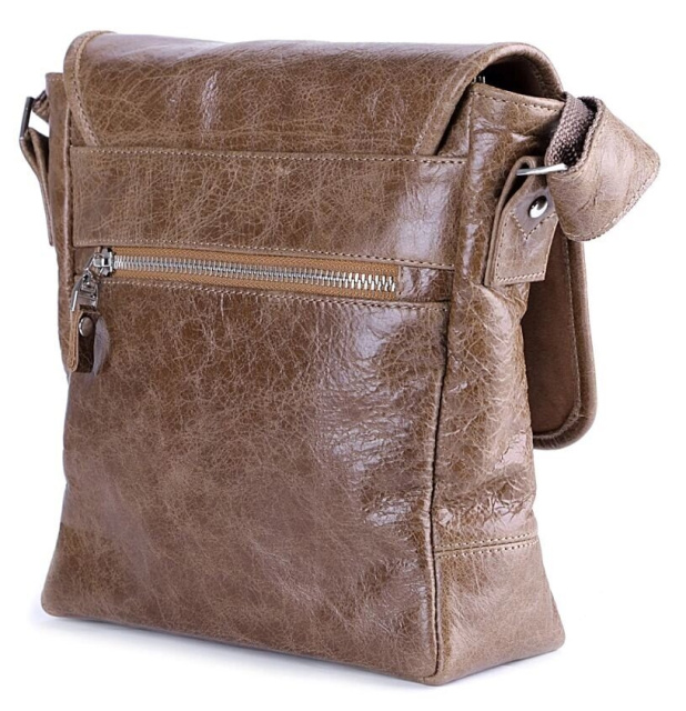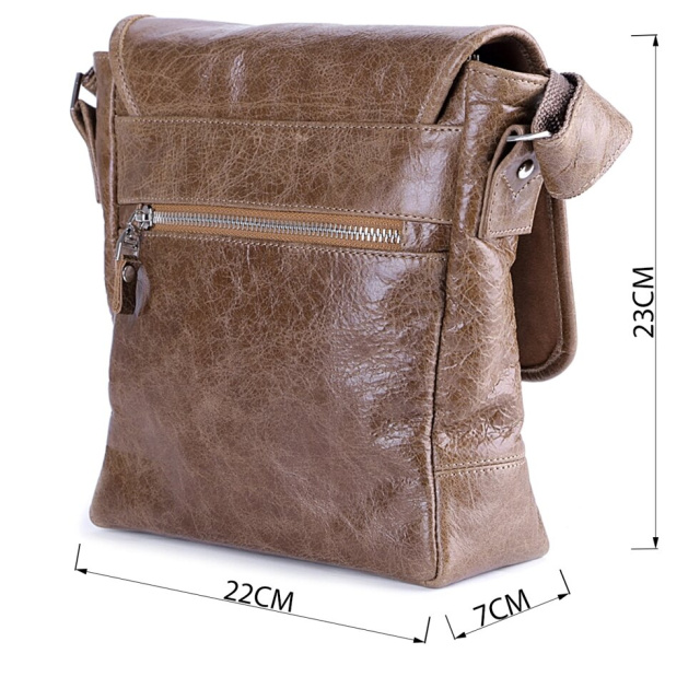 Високоякісна чоловіча сумка з натуральної вінтажної шкіри. Колір фурнітури: срібло. Сумка закривається за допомогою клапана на магнітній кнопці і металевої блискавки. Під клапаном розташована накладна кишеня. На задній зовнішній стороні аксесуара знаходиться невелике відділення на блискавці. Сумка носитися через плече за допомогою регульованого плечового ременя. Підкладка виконана з міцного текстильного матеріалу.