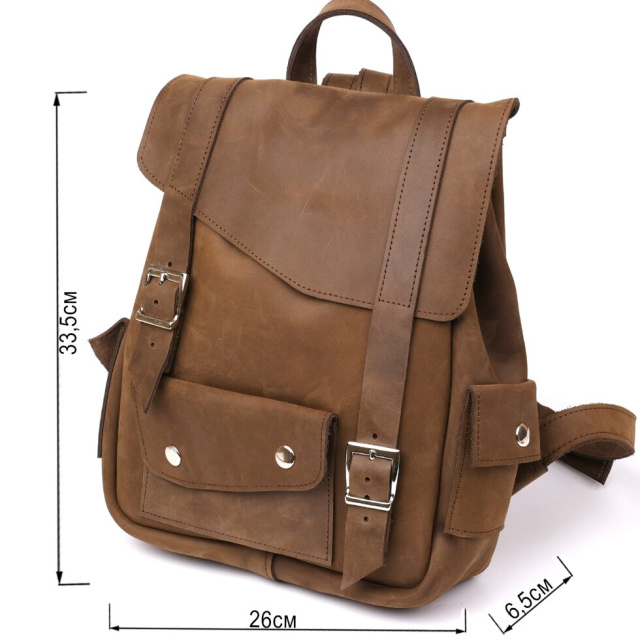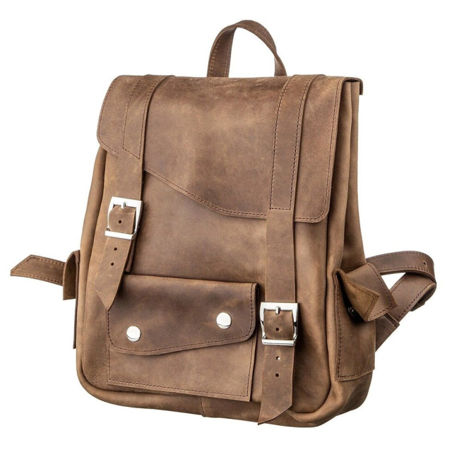 Зручний вінтажний рюкзак для міста. Варто звернути увагу, що в рюкзаку відсутня підкладка. Всередині рюкзака тильна сторона шкіри. Аксесуар доповнено сріблястою фурнітурою в дизайн. Рюкзак приємний на дотик. Надійно прошитий міцною ниткою в темних тонах, яка надає аксесуару родзинку. Шкіра, з якої виконаний рюкзак користується особливою популярністю серед багатьох клієнтів. Її вибирають за зовнішній вигляд, який змінюється в кращу сторону в процесі експлуатації, покриваючись розкішними потертостями.