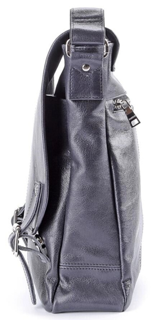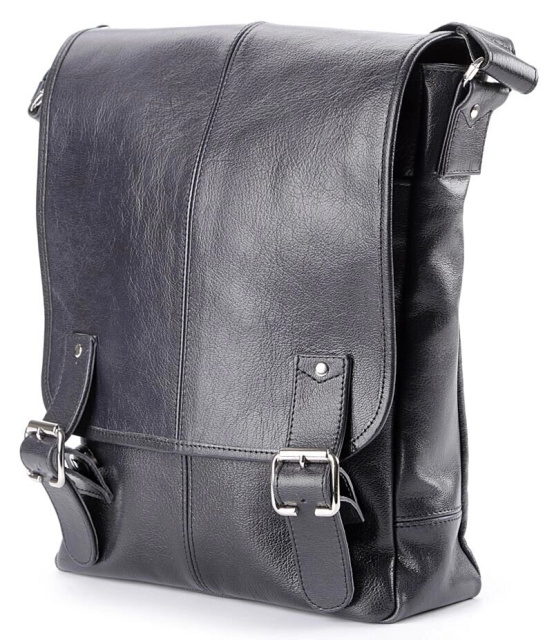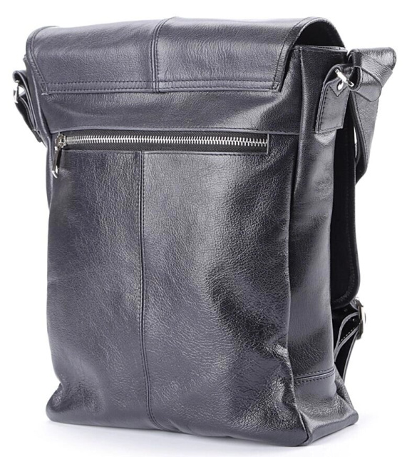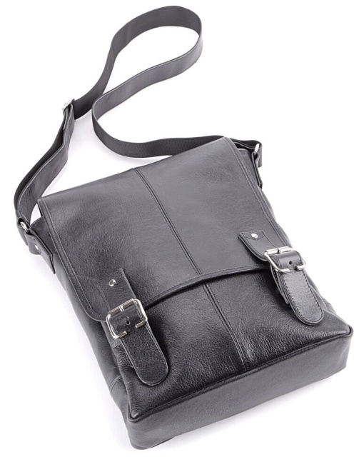 Велика шкіряна чоловіча сумка найвищої якості. Аксесуар виконаний зі шкіри чорного кольору. Шкіра м'яка, приємна на дотик. Колір фурнітури: срібло. Сумка акуратно прошита надміцною ниткою чорного кольору. На задній зовнішній стороні аксесуару розташоване відділення на блискавці. Дана модель носитися через плече. Плечовий ремінь виконаний в комбінації натуральної шкіри і міцного текстильного матеріалу. Сумка закривається за допомогою клапана і 2-х шкіряних хлястиків на магнітних кнопках, а також блискавкою. Під клапаном знаходиться вмістка накладна кишеня. Підкладка виконана з міцного текстильного матеріалу чорного кольору.