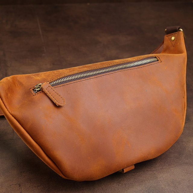 Чудова чоловіча сумка на пояс в красивому яскравому коричневому кольорі. Має шикарну вінтажну фактуру, яка виглядає просто шикарно. Всередині є містке відділення і потайна кишеня на блискавці. На тильній зовнішній стороні також розташувалась кишеня на блискавці. Така сумка може стати просто незабутнім подарунком коханій людині.
