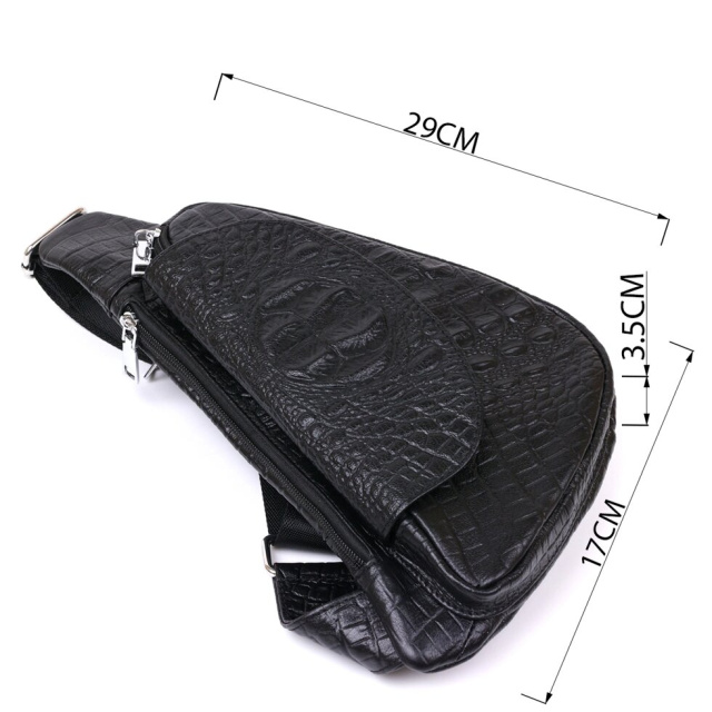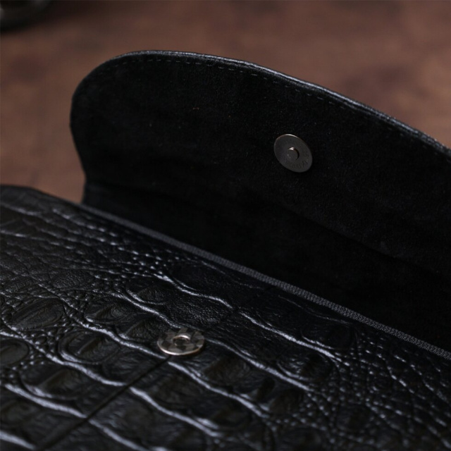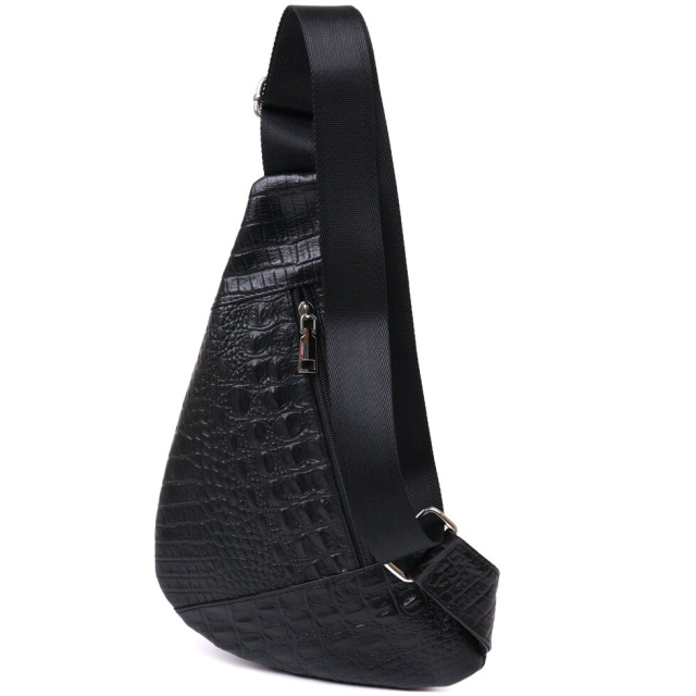 Невелика сумка через плече із натуральної високоякісної шкіри з тисненням під рептилію. Має два місткі відділення на блискавці та додаткову кишеню на тильній стороні. Ремінь виконаний з міцного текстилю і може регулюватися по довжині. Колір даної моделі – універсальний чорний, а значить підійде під будь-який колір одягу.